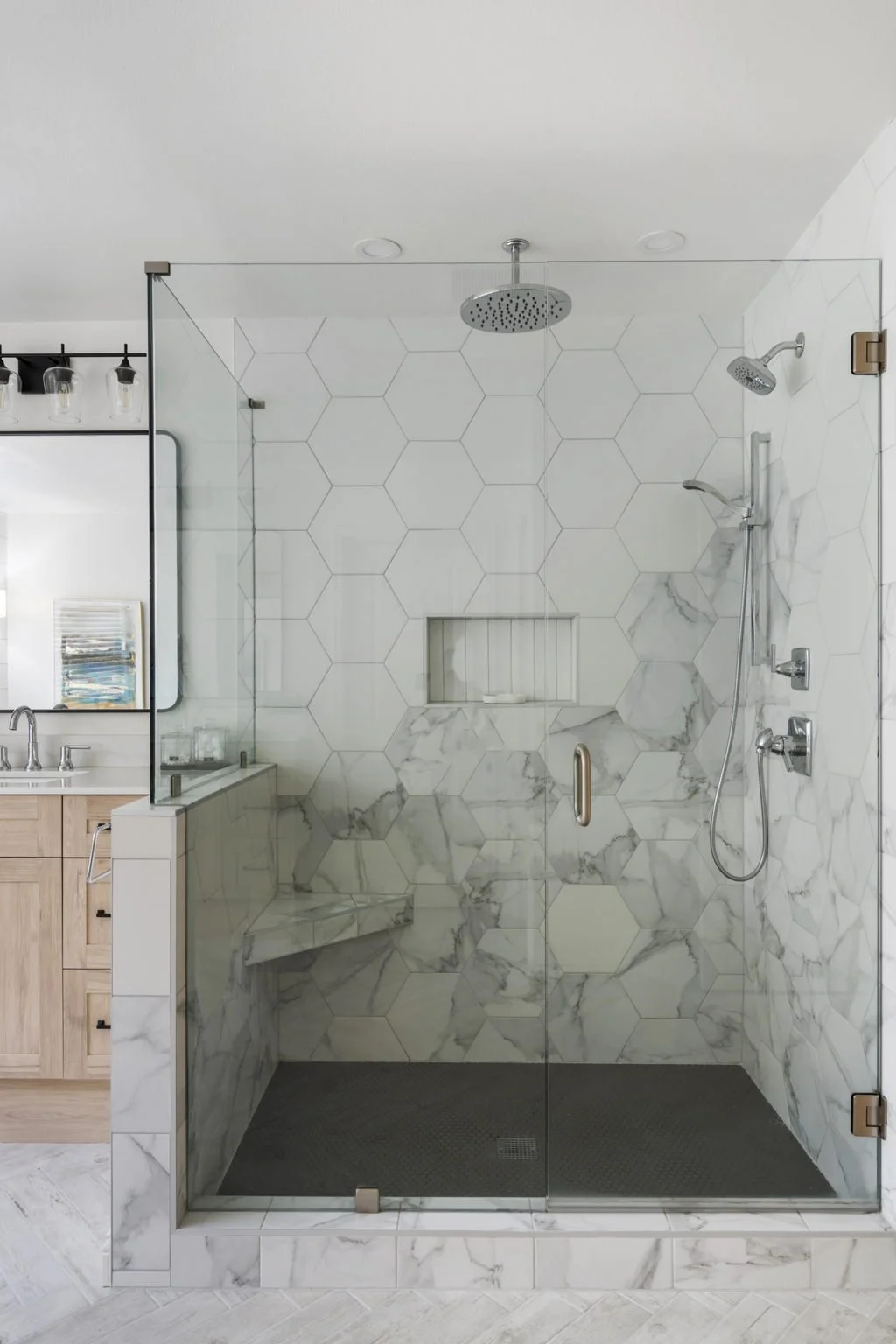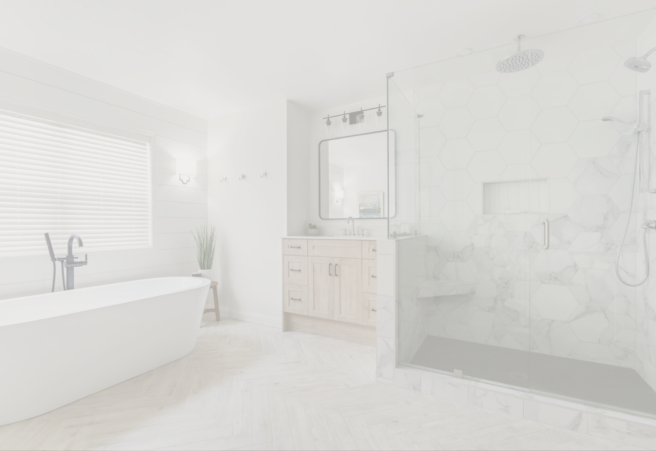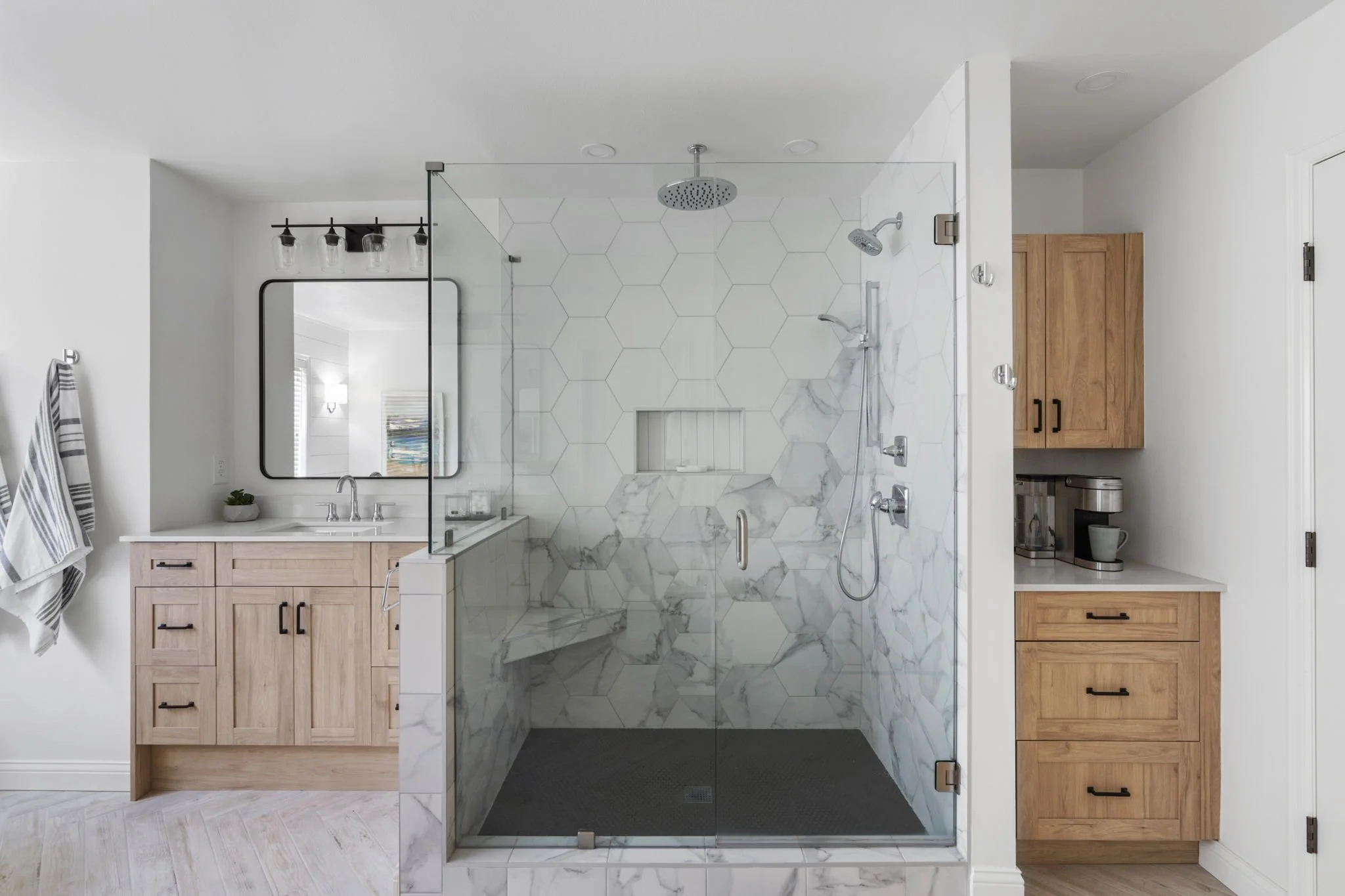 Our relationship with these clients started years ago when they first bought this home. We had the privilege of renovating their kitchen, two fireplaces and completely redecorating the main floor living space. When these clients said they were ready to remodel their primary bath we were so excited to work with them again. Having so much experience with the way we work, they were happy to leave all of the designing to us, as long as we made space for a coffee maker. We chose a wood plank floor laid out in a herringbone pattern to help add interest to such a large space. We removed large round columns and unnecessary soffit space around the tub and tying in design elements from the main floor we added shiplap to the back wall.