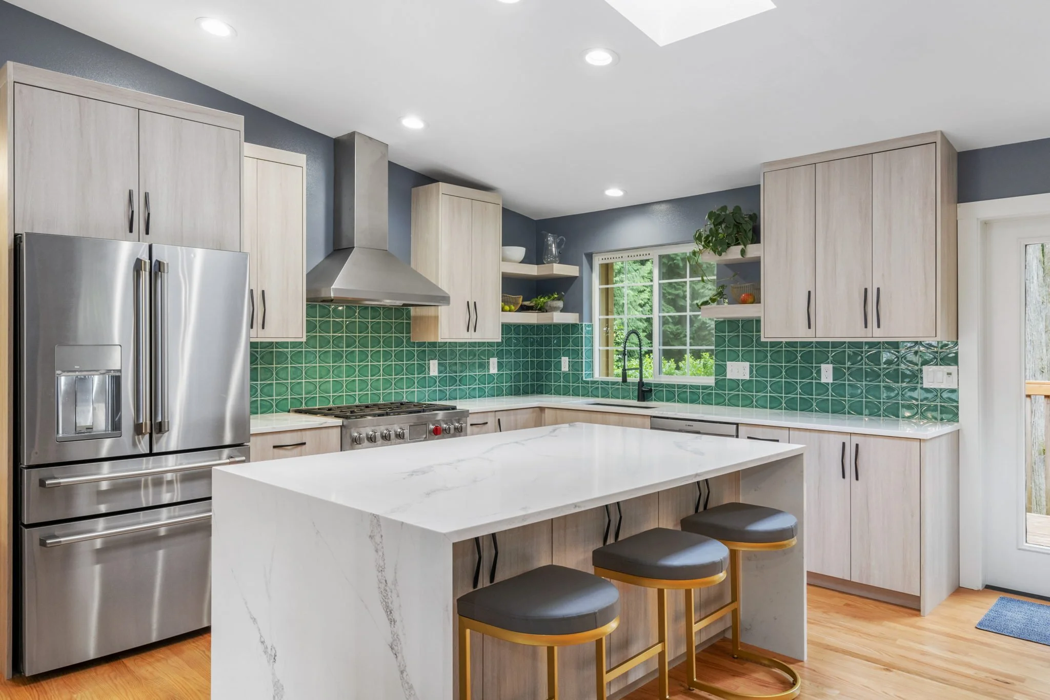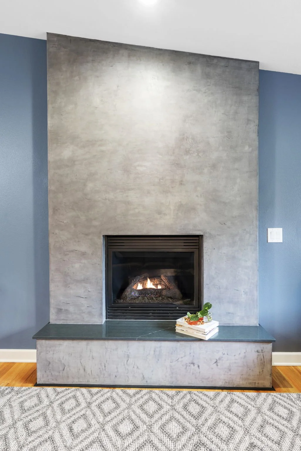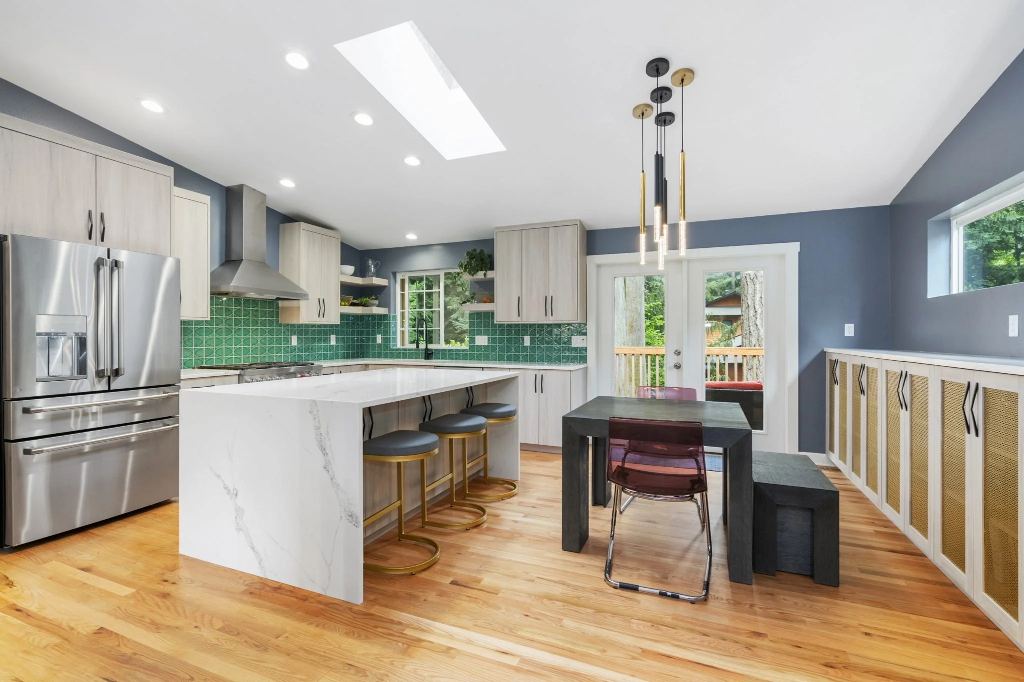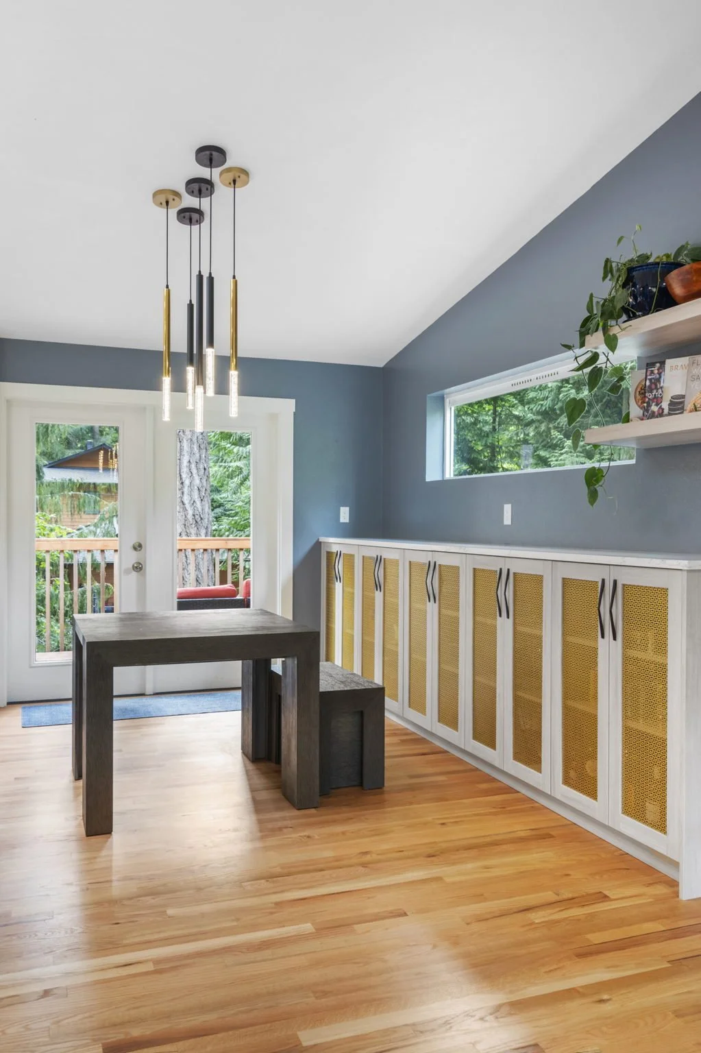 In the PNW it's difficult to bring the outdoors in without going gray so we used nature's colors as inspiration to bring this colorful and classy space to life. With two young kids at home, this family's life centers around good food made from scratch. We were able to provide ample storage by adding a beautiful buffet which doubles as additional counter space. The island was extended and a microwave drawer was added to give them even more room for all of the kneading, rolling, and the occasional art project. We went with a moody and dramatic custom concrete fireplace with a black natural stone hearth and fun pendants with pops of brass to finish off the space.