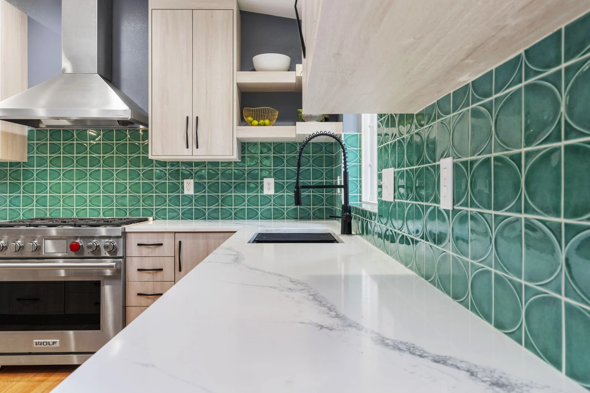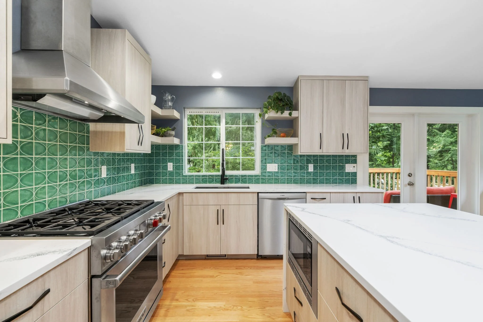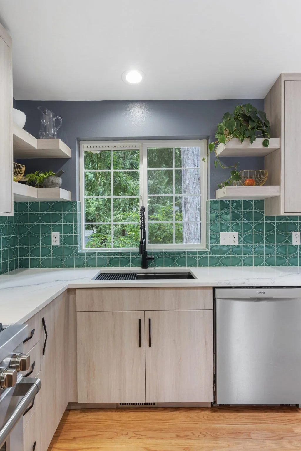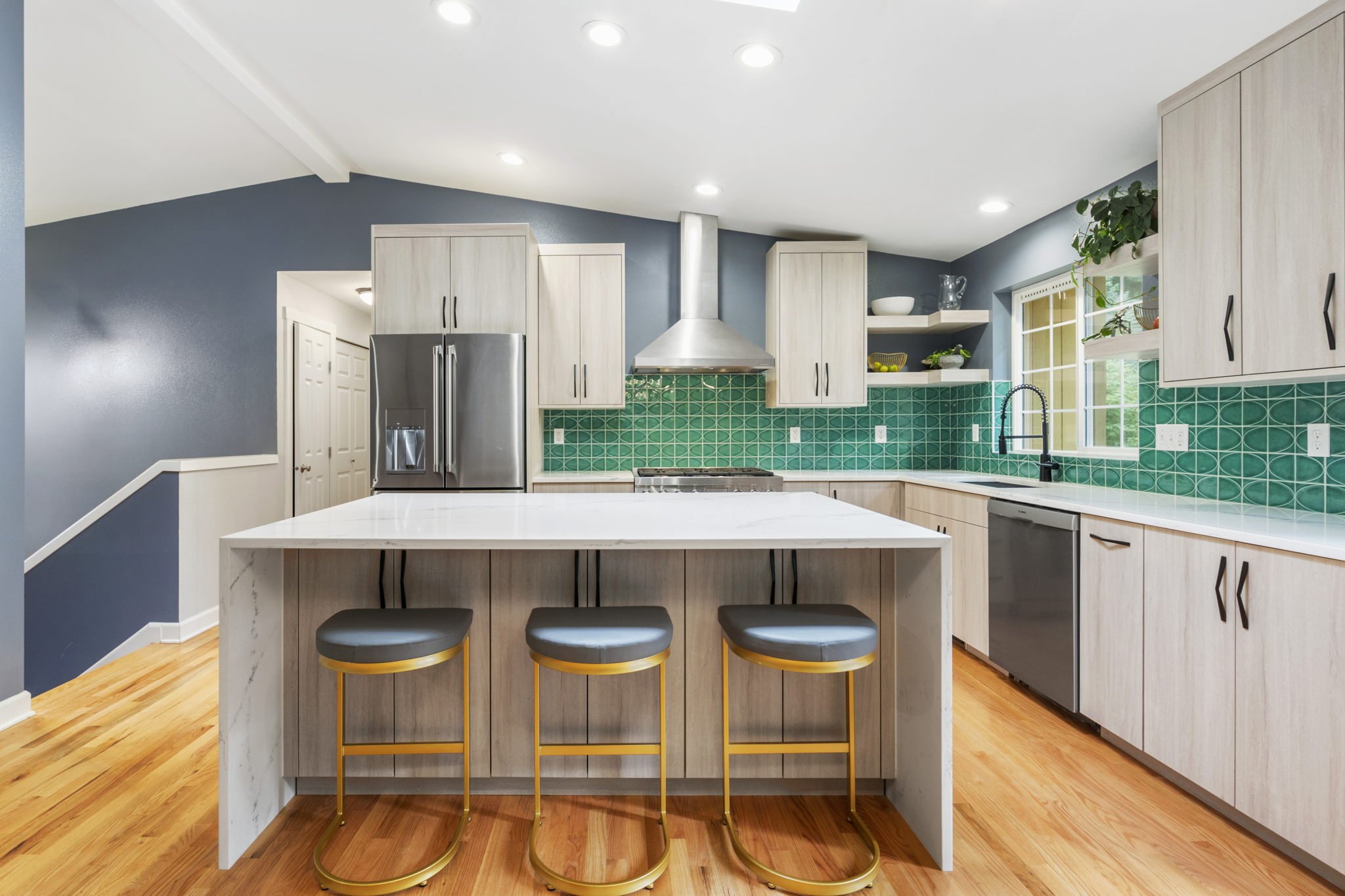 In the PNW it's difficult to bring the outdoors in without going gray so we used nature's colors as inspiration to bring this colorful and classy space to life. With two young kids at home, this family's life centers around good food made from scratch. We were able to provide ample storage by adding a beautiful buffet which doubles as additional counter space. The island was extended and a microwave drawer was added to give them even more room for all of the kneading, rolling, and the occasional art project. We went with a moody and dramatic custom concrete fireplace with a black natural stone hearth and fun pendants with pops of brass to finish off the space.